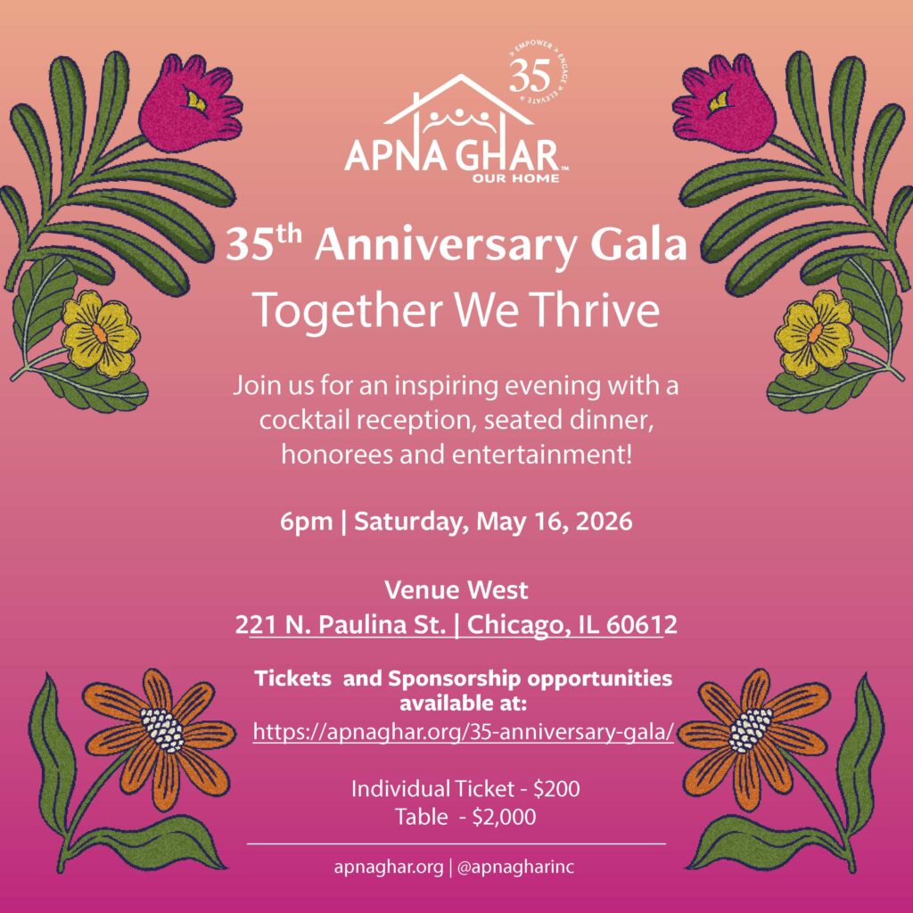Join us for Apna Ghar’s 35th Anniversary Gala: Together We Thrive at 6:00 pm on Saturday, May 16, 2026, Venue West in Chicago. The event will be a vibrant gathering with more than 300 of Chicago’s prominent civic, community and corporate leaders, activists, and organizational partners and supporters who will come together for a fun and inspiring evening.